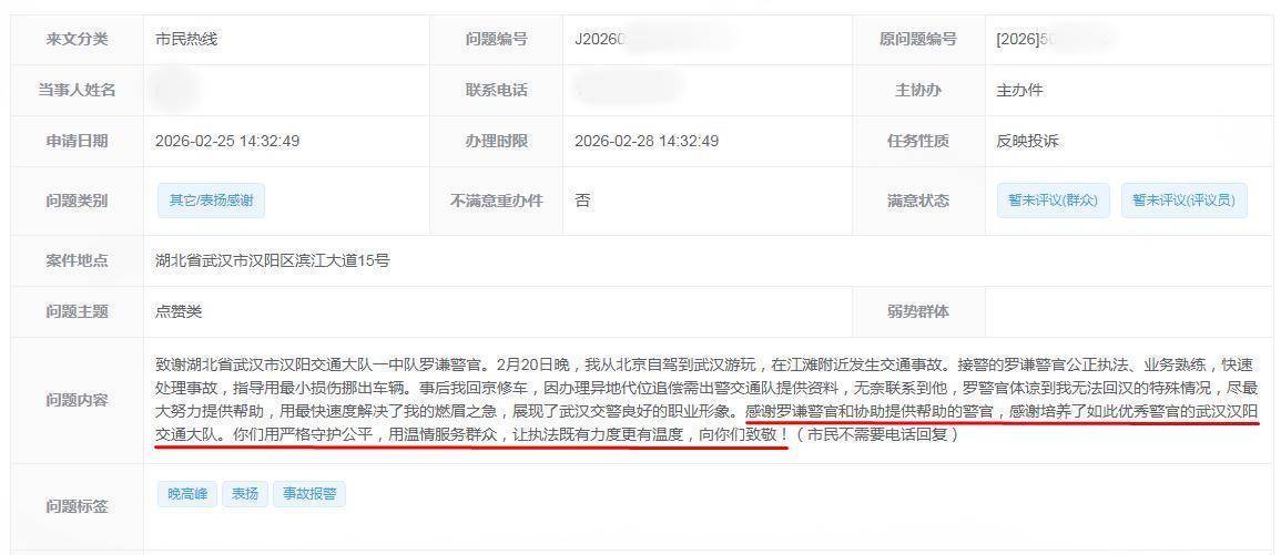 湖北日报讯(记者杨千帆、通信员易家帅)“感谢罗谦警官,感谢培养了如斯优秀警官的武汉汉阳交通大队!”2月25日,新年上班第二个使命日,武汉汉阳区公本分局交管大队在市民热线平台上,收到逾越沉的点赞留言。当事东谈主魏女士对民警罗谦在交通事故处理中公平规矩、顺心处事,相配是主动协助外地司机惩办本色不毛抒发丹心戴德。