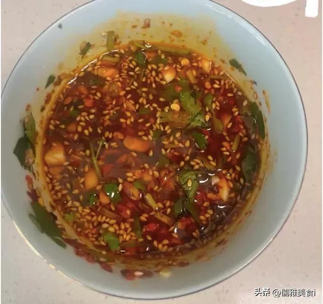 8.再调一碗超开胃的家常蘸汁:碗里放入蒜蓉、辣椒油、熟芝麻、葱花和香菜,加少量醋、盐搅动均匀,临了淋上香油和花椒油提香,拌匀后香味完全,蘸着丸子吃鲜香味更浓。