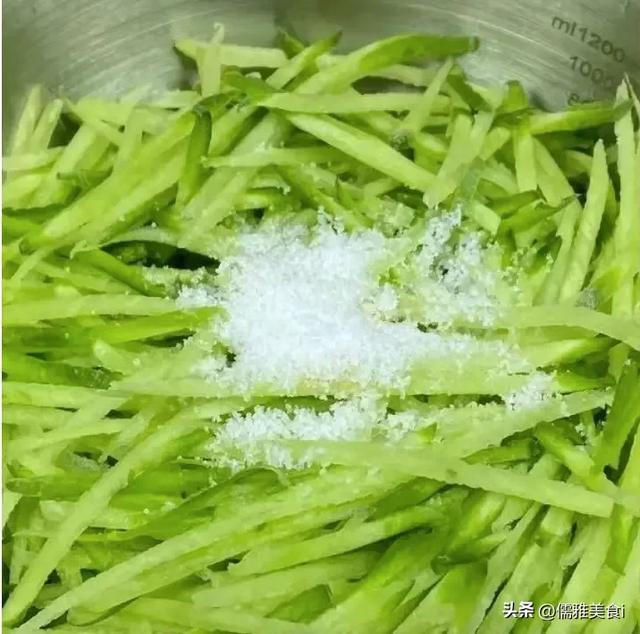 3. 萝卜丝加少量食盐握匀,腌制10分钟杀出水分