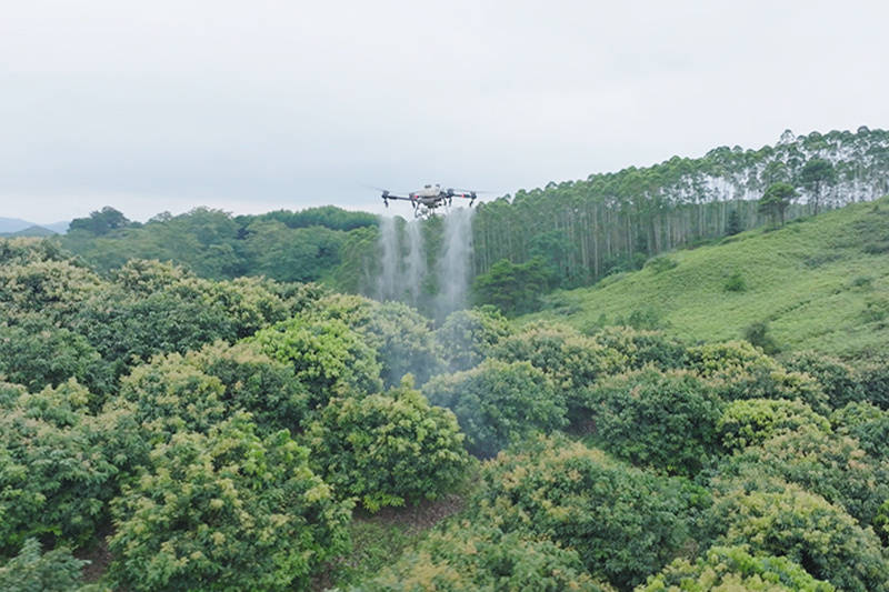 无东谈主机正在给荔枝林喷洒农药。“桂鸟先飞”团队供图